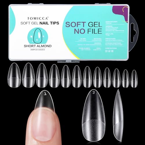 TOMICCA Almond korta nageltipss-tips för gelnaglar, gel full täckning nageltips, förformade halvmatt spetsar naglar gely nagelspetsar för akrylnaglar – 240 stycken 12 storlekar