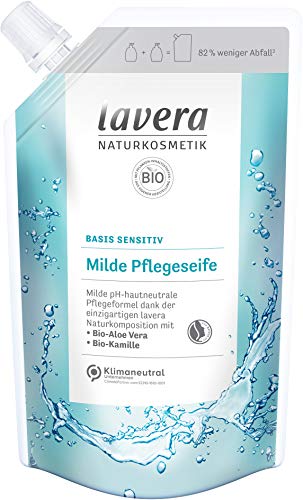 lavera påfyllningspåse bas känslig mild vård tvål • Ekologisk aloe vera & ekologisk kamomill • mild rengöring • även lämplig för känslig och torr hud • Vegan • pH-neutral • 6 x 500 ml
