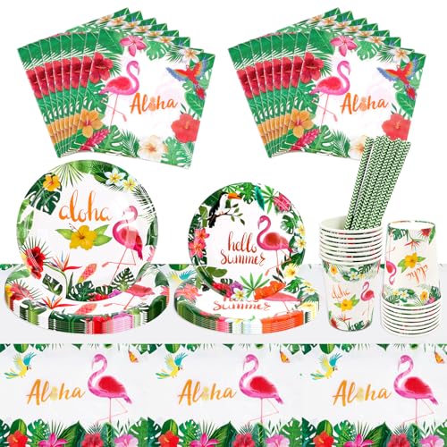Flamingo partyservis set 81 stycken, Aloha Hawaii party porslinsset, barns födelsedagskalas köksdekoration, flamingo papperstallrikar, servetter, sommarmotiv, fester, dekoration, pojke flicka för 16