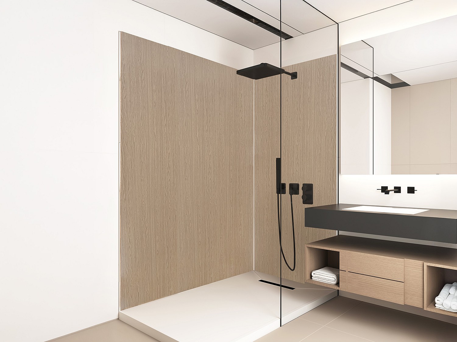 Set med 2 duschväggspaneler med ljust träeffekt i aluminium med profiler - L90 x L120 x H210 cm - ENEKO
