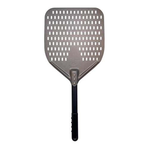 PIZZERELLA Premium pizzaspade med gratis pizzaskärare – 30 x 35,5 x 66 cm perforerad spade av hårdanodiserad aluminium – rektangulär professionell spade med förlängt silikonhandtag