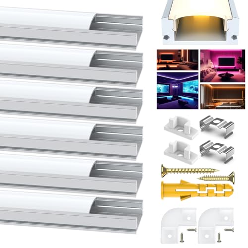 Angdarun LED-profil, 6 x 1 m, U-formad aluminium, aluminiumremsor för kanal/skena, med mjölkvitt lock, monteringsmaterial (6 x 1 m-U)