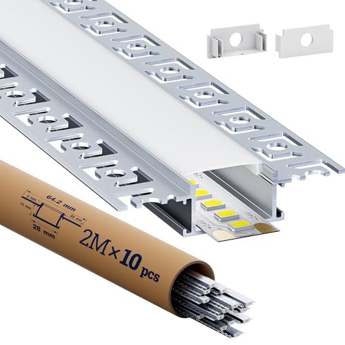 HOOLED - Aluminium profil led 2m x 10 st,(20m), U-form kompakt professionell finish med mjölkvitt lock, spetsar, metallmonteringsklämmor, storlekar 64,2 x 13,8 mm (SP44)