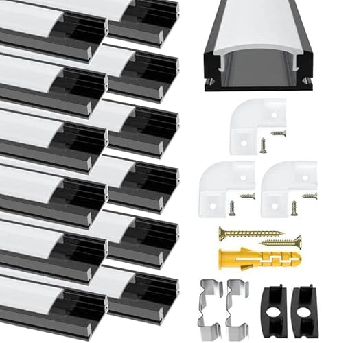 Chesbung LED-remsprofil, 12-pack LED aluminiumkanal 1 m svart U-formad LED-profil med mjölkvitt skydd, ändlock, monteringsklämmor aluminium extrudering 90 graders kontakter för LED-lysrör