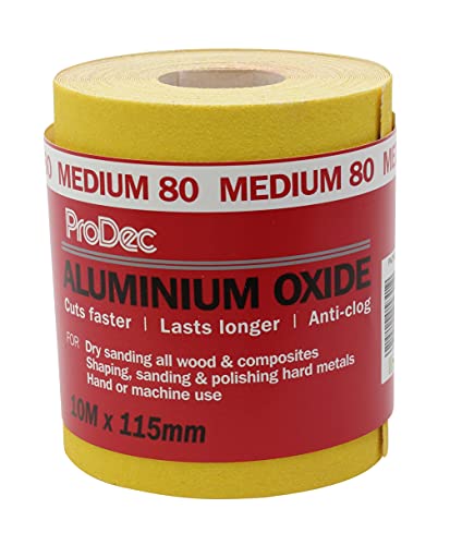 ProDec 5 m rulle 80 korn medium kvalitet grön aluminiumoxid slipande slipppapper för slipning av trä, färg, gips, fyllning, metall och mer, 115 mm brett sandpapper kompatibelt med maskinslipmaskiner