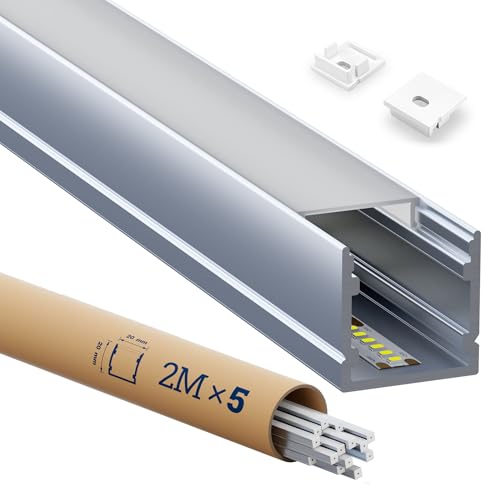 HOOLED Aluminiumprofiler för LED-remsor 2 m x 5 st (10 m), rektangulära profiler 20 mm x 20 mm med matt PC-skydd för remsor från olika tillverkare, maximal bredd 14,9 mm