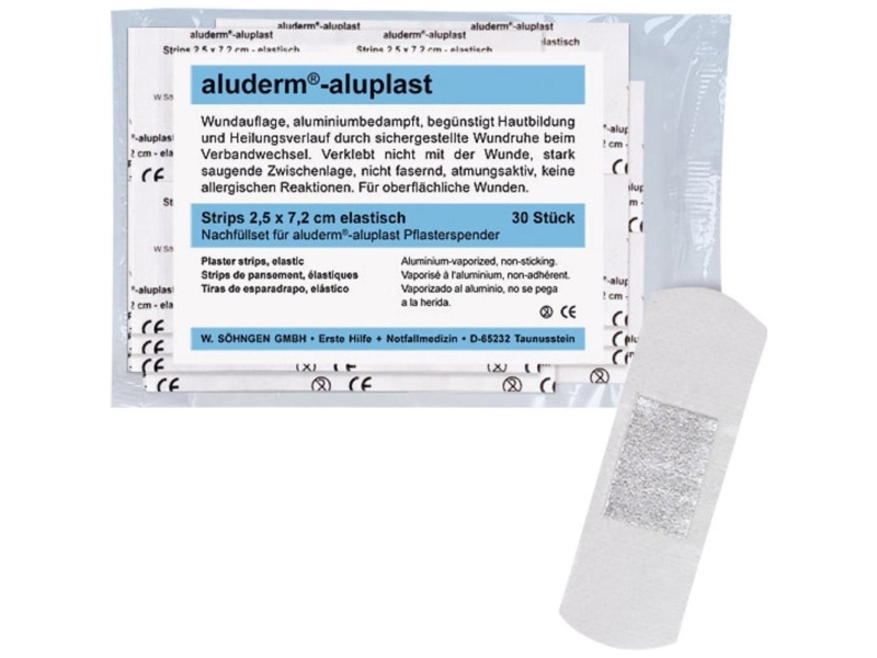 Elastische Abschnitte Einzeln Eingesiegelt, Verpackt In Pe-Beutel. Aluderm®-Aluplast Wundverbandpflaster. Aluderm®-Aluplast Ist Das Besondere Wundverbandpflaster Mit Aluminiumbedampfter Aluderm® Wundauflage Und Saugvlies. Aluderm® Verklebt Nicht Mit