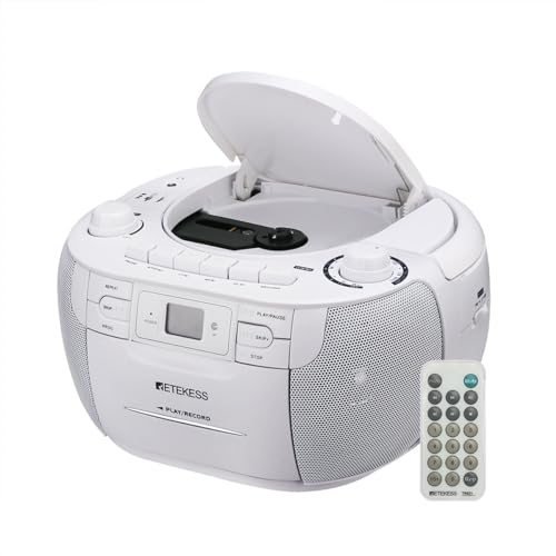 Retekess TR621 Bärbar CD-spelare Boombox Stereo med AM FM-radio, Kassettspelare, Kassettinspelare, Stöd för USB, TF, Hörlurar, med Fjärrkontroll (vit)
