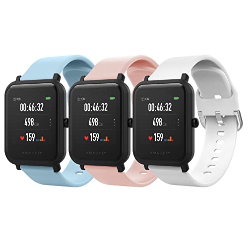 MoKo 3 Pack Straps Compatible with Amazfit Active/Active 2/GTS/GTS 2/2 Mini/2e/3/4/4 Mini/Bip 3/3 Pro/Bip U/U Pro/GTR Mini/42mm, 20mm Soft Silicone Replacement Sport Watch Band for Women Men, LB+P+W