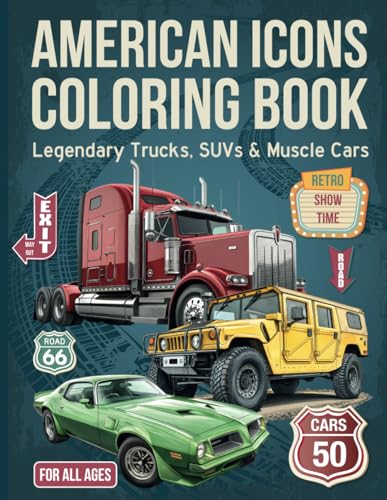 American Icons Coloring Book: Legendary Trucks, SUVs & Muscle Cars: 50 Classic American Cars, Trucks & SUVs to Color – Fun Book for Car Lovers of All Ages
