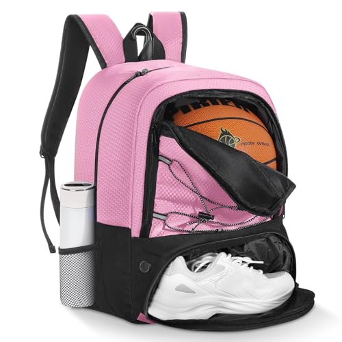 MoKo Basketball Bag Backpack, Soccer Backpack for Men & Women with Separate Ball and Shoes Compartments, Water-Resistant, Fence Hook, Sports Bag for Clothes, Shoes, Tablets, Laptops, Pink