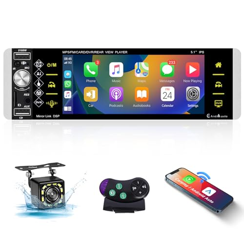 Hodozzy RDS bilradio 1 Din med trådlös Carplay Android Auto, 5,1 tum stereo bil Bluetooth med IPS-skärm, pekskärm med spegellänk/FM/USB/AUX/SWC/röststyrning + backkamera