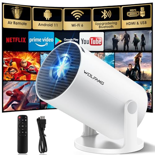 [Inbyggda appar och Android 11.0] WOLFANG bärbar projektor 20000 Lux 4K stöds 180°rotation och automatisk nyckelsten, utomhuskompatibel med TV-stick/Windows/iOS/Android/HDMI/USB (1080P)