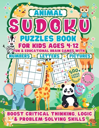 Animal Sudoku Puzzle Book for Kids Ages 4-12. Fun & Educational Brain Games with Numbers, Letters and Pictures.: 500+ Easy to Hard Large Print ... Skills. Includes Bonus Printable Activities.