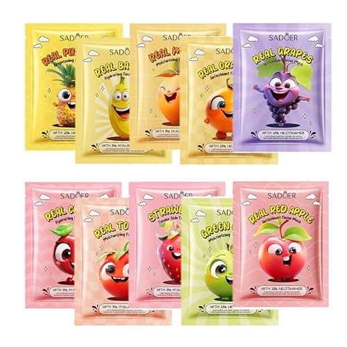 Set med 10 naturliga fruktiga ansiktsmasker, fuktgivande, fuktgivande, djuprengörande porer, näring, anti-åldrande, ark ansiktsmask för alla hudtyper ansiktsmasker kvinnor, barn flickor hudvård