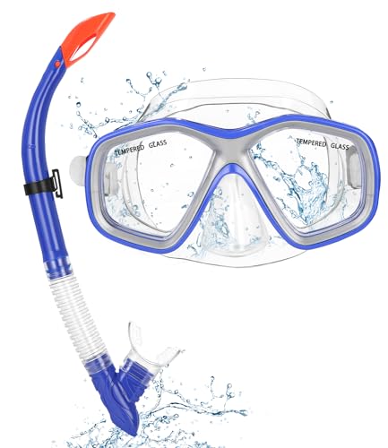 Glasögon och Snorkelrör Set för barn, 180° Panorama, läckagesäker, anti-dimma härdat glas och torr dykning ansiktsmask, för snorkling simning och dykning