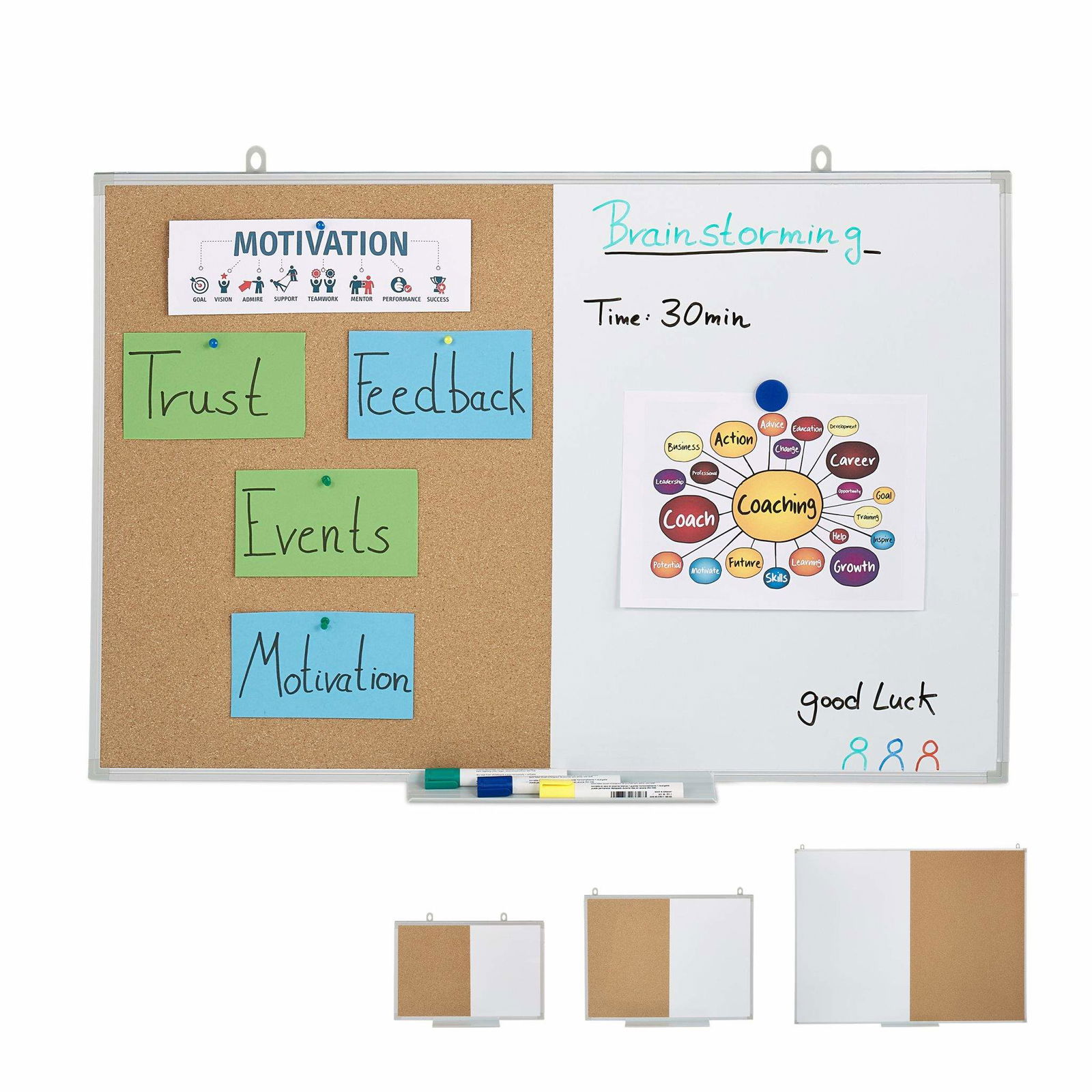 Relaxdays Kombitavla 3-i-1, HxB: 50 x 70 cm, whiteboard, anslagstavla, krittavla, tillbehör, magnetisk memoboard, flerfärgad
