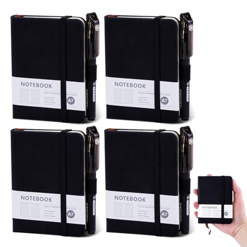 SHILIPAIJC 4 stycken små anteckningsblock, mini anteckningsblock, A7, inbunden anteckningsböcker med penna, gummistängning, ficka anteckningsbok, fickanteckningsbok fickor, dagbok, svart för skola,