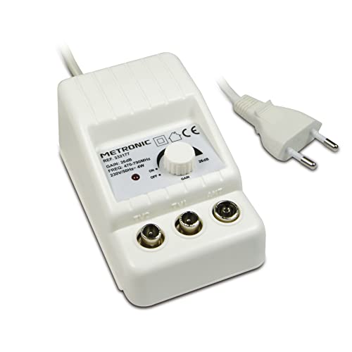 Metronic - 332177, inomhus TV-antennförstärkare för TDT-kanaler, kompatibel med 4G/5G, 26 dB, 2 utgångar med 9,52 mm TV-uttag, vit