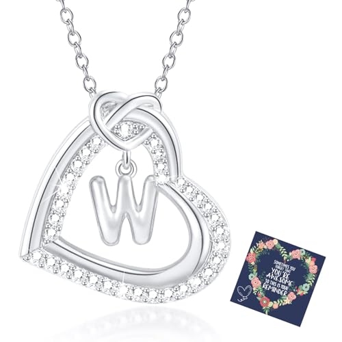 Halsband Kvinnor Silver Necklace Kvinnor Zirkonia Hjärta Hängsmycke Necklace med bokstäver A-Ö Halsband Dam Presenter för Kvinnor Flicka Flickvän 18 + 2 tum (Silver W)