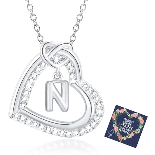 Halsband Kvinnor Silver Necklace Kvinnor Zirkonia Hjärta Hängsmycke Necklace med bokstäver A-Ö Halsband Dam Presenter för Kvinnor Flicka Flickvän 18 + 2 tum (Silver N)