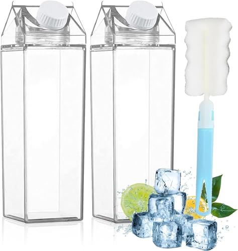 Latrt 2 stycken transparent mjölklåda vattenflaska återanvändbar mjölkkartong med koppborste, för förvaring av drycker, picknick, camping, mjölk, apelsinjuice, öl i kylskåpet, 1 l