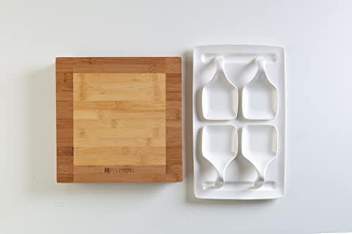 DEAGOURMET Förrätt och aperitif med skärbräda i naturligt trä och set med 4 rätters bricka i fint vitt porslin