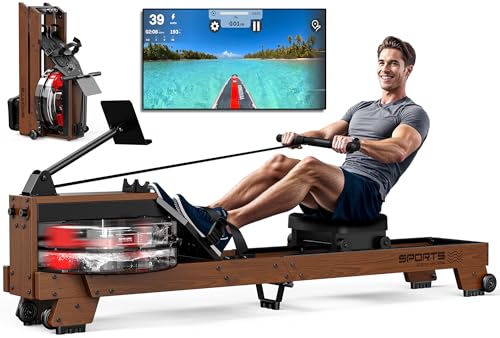 MERACH Vikbar roddmaskin i trä för hemgym, vattenbeständig roddmaskin med 180 kg viktkapacitet, dedikerad skärm och bekvämt säte, gratis MERACH-app för uppslukande träning (vatten)