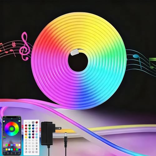 ShineBurky Neon LED-remsa, 5 m, RGB-IC-LED-neonljus, 12 V med App-kontroll, Bluetooth, IR-fjärrkontroll, IP65, vattentät, flexibel LED-remsa för sovrum, fest, vekorering, med strömförsörjning