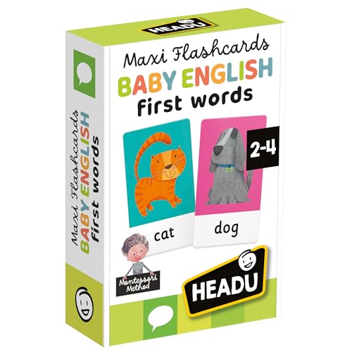 HEADU - Maxi Montessori Baby engelska flashcards - första ord på engelska | Flashcards för 2–4 år, Montessori pedagogiska spel, uttal och lyssnande med app, julklapp påsk, tillverkad i Italien