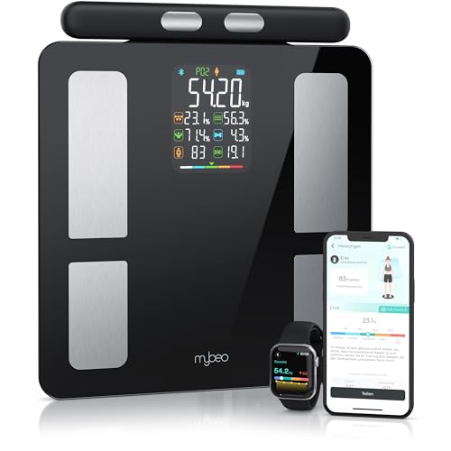 Mybeo – Kroppsfettvåg med handsensorer – med app – digital Bluetooth kroppsvåg – personvåg multifunktionell våg – digital display – handtag för exakta resultat – med kroppsfettanalys