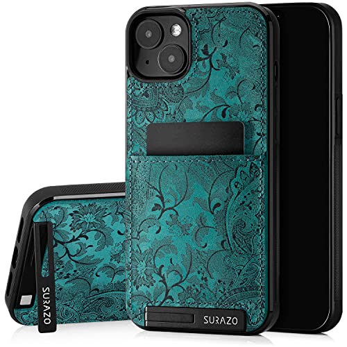 SURAZO äkta läderbaksida fodral för Apple iPhone 15 Plus fodral – stötsäkert läder mobiltelefonfodral med [kortfack, stativfunktion, nyckelring] blommig smal stötfångare skyddsfodral (prydnad turkos)