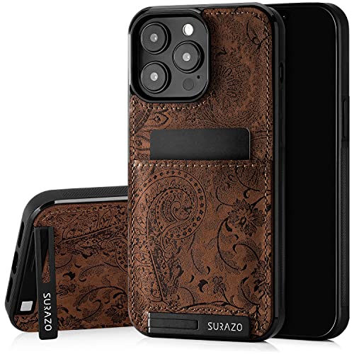 SURAZO äkta läder bakskal för Apple iPhone 15 Pro Max – stötsäkert läder mobiltelefonfodral med [kortfack, stativfunktion, nyckelring] blommig smal stötfångare skyddsfodral (prydnadsbrun)