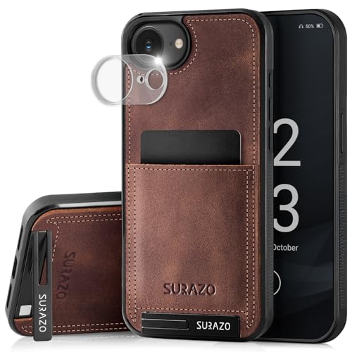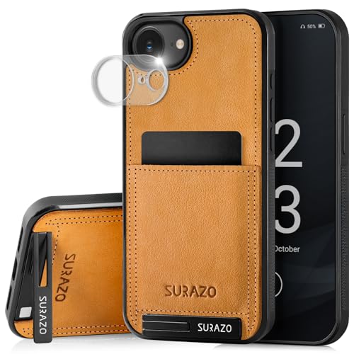 SURAZO läderfodral för Apple iPhone 16e, fodral med kameraskydd – äkta läderbaksida mobiltelefonfodral [stativfunktion] [nyckelring] stötsäkert äkta läder skyddande läderfodral (brun)