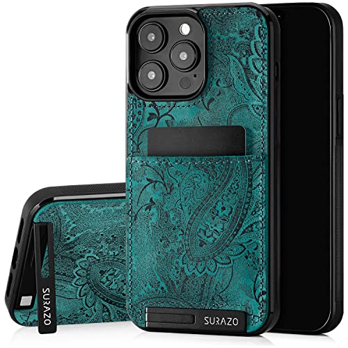 SURAZO äkta läder bakskal för Apple iPhone 15 Pro Max – stötsäkert läder mobiltelefonfodral med [kortfack, stativfunktion, nyckelring] blommig smal stötfångare skyddsfodral (prydnad turkos)