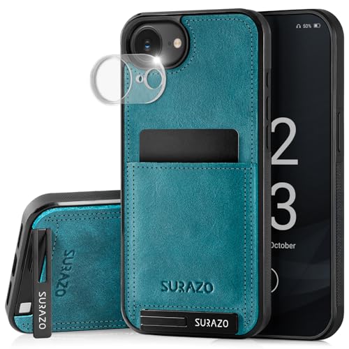 SURAZO läderfodral för Apple iPhone 16e, fodral med kameraskydd – äkta läderbaksida mobiltelefonfodral [stativfunktion] [nyckelring] stötsäkert äkta läder skyddande läderfodral (turkos)