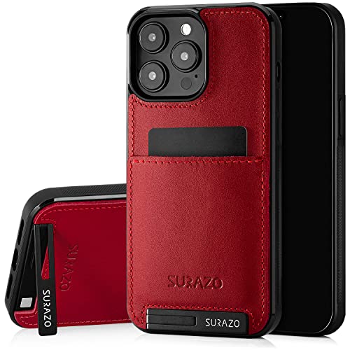 SURAZO äkta läder bakskal för Apple iPhone 15 Pro Max – stötsäkert läder mobiltelefonfodral med [kortfack, stativfunktion, nyckelring] vintage smal stötfångare skyddsfodral (Costa röd)