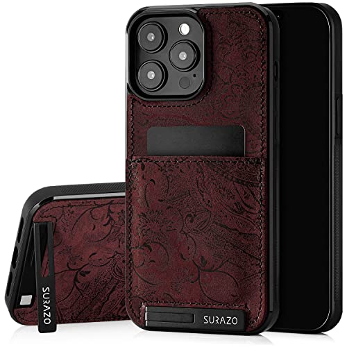 SURAZO äkta läder-bakfodral för Apple iPhone 15 Pro Max fodral – stötsäkert läder mobiltelefonfodral med [kortfack, stativfunktion, nyckelring] blommig smal stötfångare skyddsfodral (prydnad vinröd)