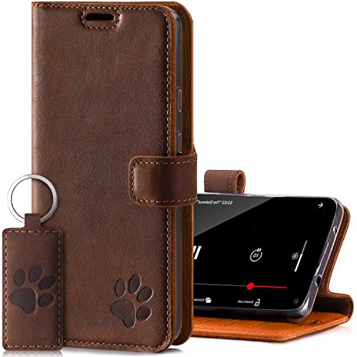 SURAZO Premium mobiltelefonfodral för Apple iPhone X XS – äkta läderskal med tass-motiv – vintage läder vikbart fodral med stativfunktion, kortficka, nyckelring – handgjort RFID-skyddsfodral (nötbrun)