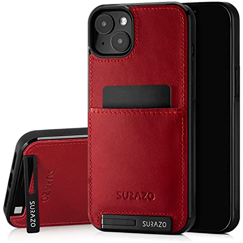 SURAZO äkta läder bakskal för Apple iPhone 15 – stötsäkert läder mobiltelefonfodral med [kortfack, stativfunktion, nyckelring] vintage smal stötfångare skyddsfodral (Costa röd)