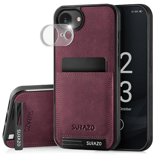 SURAZO läderfodral för Apple iPhone 16e, fodral med kameraskydd – äkta läderbaksida mobiltelefonfodral [stativfunktion] [nyckelring] stötsäkert äkta läder skyddande läderfodral (vinröd)