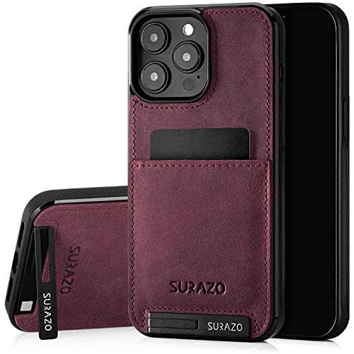 SURAZO äkta läder bakskal för Apple iPhone 15 Pro Max – stötsäkert läder mobiltelefonfodral med [kortfack, stativfunktion, nyckelring] vintage smal stötfångare skyddsfodral (vinröd)