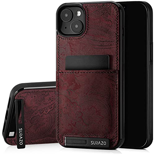 SURAZO äkta läder bakskal för Apple iPhone 15 Plus fodral – stötsäkert läder mobiltelefonfodral med [kortfack, stativfunktion, nyckelring] blommig smal stötfångare skyddsfodral (ornament vinröd)