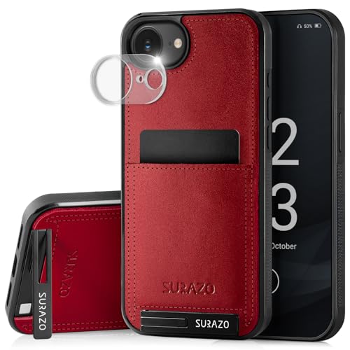 SURAZO läderfodral för Apple iPhone 16e, fodral med kameraskydd – äkta läderbaksida mobiltelefonfodral [stativfunktion] [nyckelring] stötsäkert äkta läder skyddande läderfodral (röd)