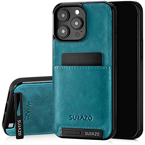 SURAZO äkta läder bakskal för Apple iPhone 15 Pro Max – stötsäkert läder mobiltelefonfodral med [kortfack, stativfunktion, nyckelring] vintage smal stötfångare skyddsfodral (turkos)