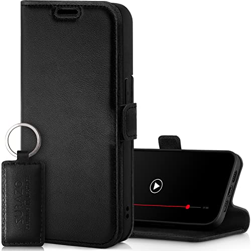 SURAZO äkta läder bakskal för Apple iPhone 15 Pro Max – stötsäkert läder mobiltelefonfodral med [kortfack, stativfunktion, nyckelring] vintage smal stötfångare skyddsfodral (Costa svart)