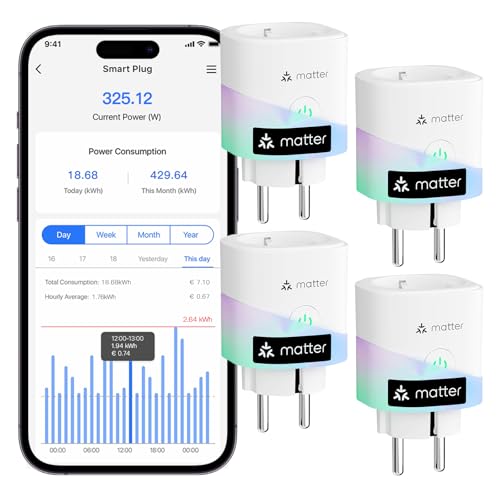 Meross_Smart Matter WLAN-uttag med strömmätning, smart hemuttag med elmätare, fungerar Apple HomeKit, Alexa och Google, röst- och fjärrkontroll, 16 A, 4 st