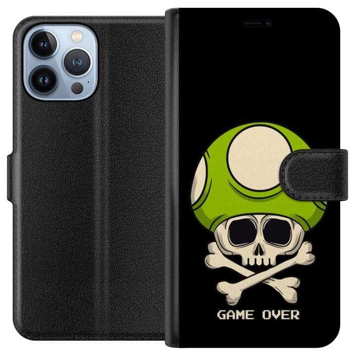 Kompatibelt Plånboksfodral till Apple iPhone 13 Pro Max Apple Spelinspirerat motiv med dödskalle och grön svamp i retrostil med texten game over