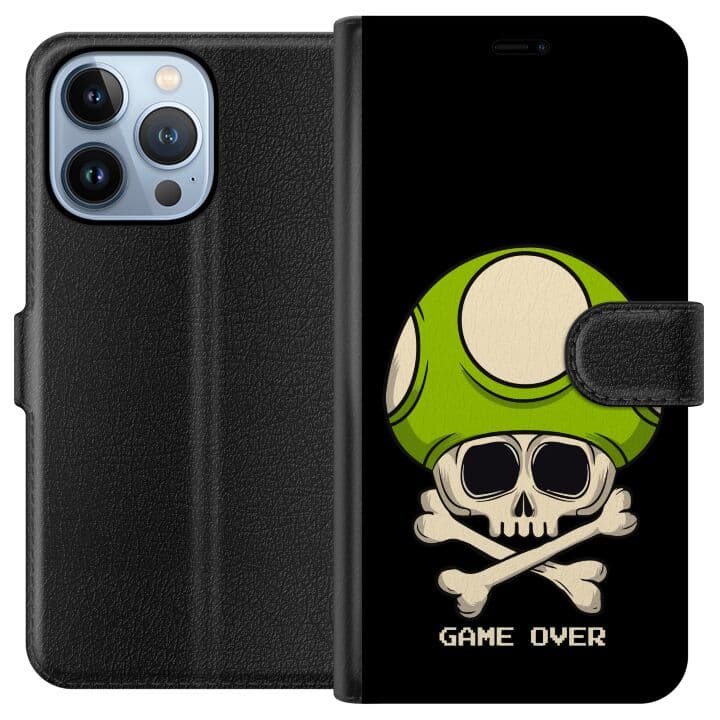 Kompatibelt Plånboksfodral till Apple iPhone 13 Pro Apple Spelinspirerat motiv med dödskalle och grön svamp i retrostil med texten game over