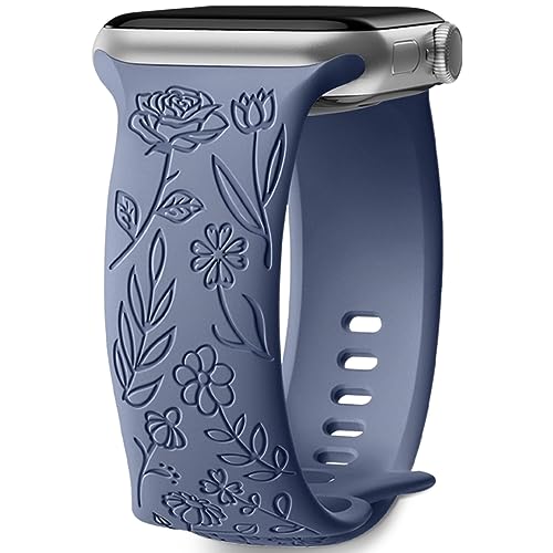 Mastten Blommig graverad rem kompatibel med Apple Watch-remmar 38 mm 40 mm 41 mm 42 mm kvinnor, mjukt silikon elegant rosblommigt band för iWatch SE 3 2 1 serie 11 10 9 8 7 6 5 4 3 2 1, blå grå